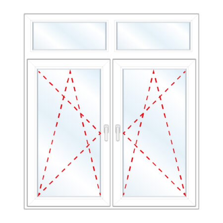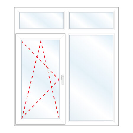 Okno dwuskrzydłowe, lewe rozwierno-uchylne w lewą stronę, nadstawka uchylna szklona w skrzydle, prawe rozwierno-uchylne w prawą stronę, nadstawka uchylna szklona w skrzydle.