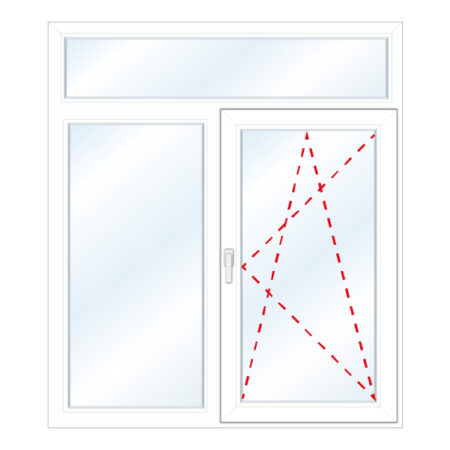 Okno dwuskrzydłowe, lewe skrzydło nieotwieralne, szklone w ramie, prawe rozwierno-uchylne w prawą stronę, nadstawka nieotwieralna szklona bezpośrednio w ramie