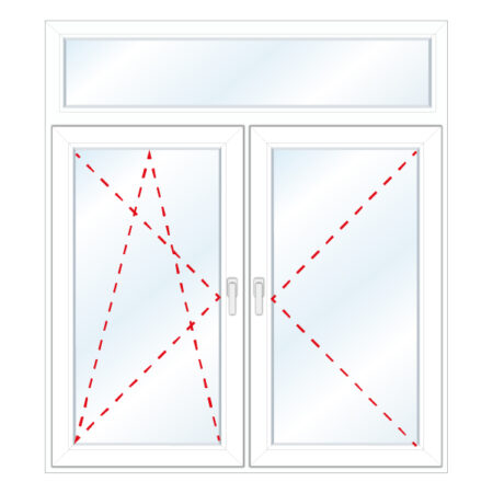 Okno dwuskrzydłowe, lewe nieotwieralne, szklone w ramie, prawe nieotwieralne, szklone w ramie, nadstawka uchylna szklona w skrzydle.