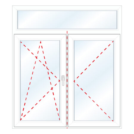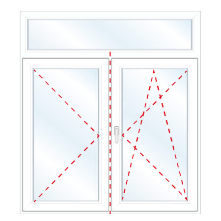 Okno dwuskrzydłowe, lewe rozwierno-uchylne w lewą stronę, prawe rozwierno-uchylne w prawą stronę, nadstawka nieotwieralna szklona w skrzydle.