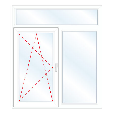 Okno dwuskrzydłowe, lewe nieotwieralne, szklone w ramie, prawe nieotwieralne, szklone w ramie, nadstawka uchylna szklona w skrzydle.