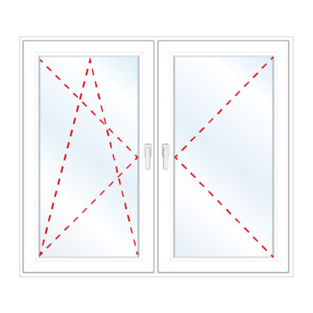 Okno dwuskrzydłowe, lewe rozwierno-uchylne w lewą stronę, prawe, rozwierne w prawą stronę, słupek stały.