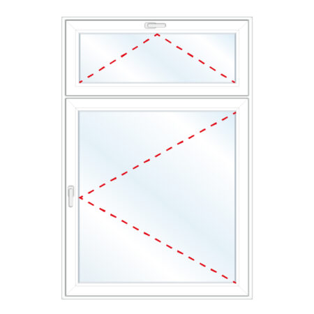 Okno rozwierne w prawą stronę, nieuchylne, nadstawka uchylna szklona w skrzydle.