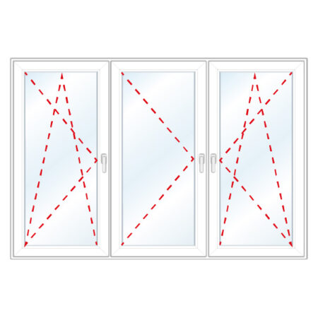 Okno trzyskrzydłowe, lewe rozwierne w lewą stronę, środkowe rozwierne w lewą stronę, prawe rozwierno-uchylne w prawą stronę, słupek stały.